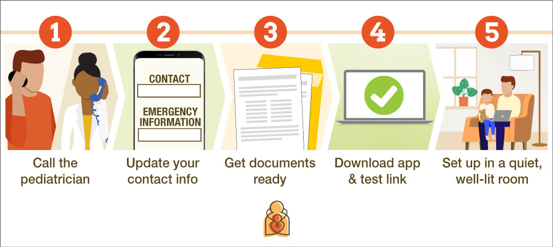 Your pediatrician's office is the starting point for all telehealth visits. They know your child and they know your family. If you need an interpreter or assistance for vision, hearing or speech difficulties, let them know when you schedule your appointment. Insurance might cover telehealth. Check your plan and check with your doctor's office first.
