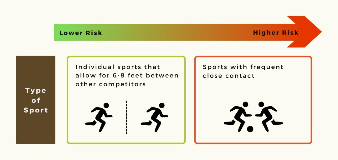 Sports and physical activities with limited exposure to other players may be a safer option. A sprint in a track race, for example, may be less risky than sports that put someone in close contact with another player for an extended period of time, like an entire half of a game.