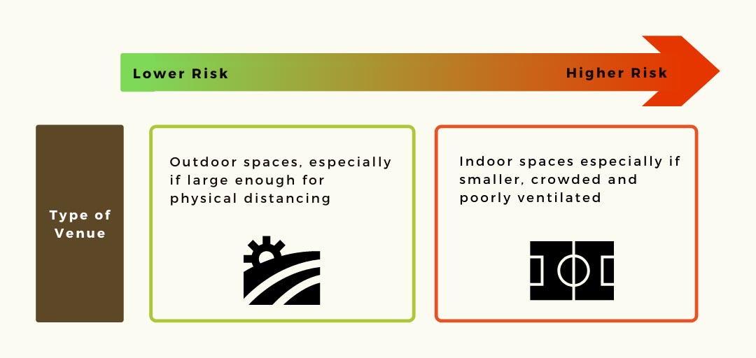 Where athletes train, practice and compete also impacts risk. COVID-19 is more likely to spread in closed indoor spaces with poor ventilation. Indoor sports and activities will likely be more risky, evidence suggests, especially wrestling and ice hockey. Choose outdoor venues for sports and classes whenever possible.