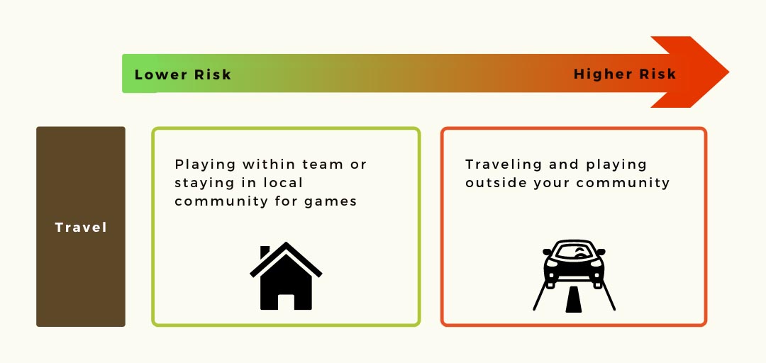 Staying within your community will be safer than participating on travel teams. Traveling to an area with more COVID-19 cases could increase the chance of transmission and spread. Travel sports also include intermixing of players, so athletes are generally exposed to more people.