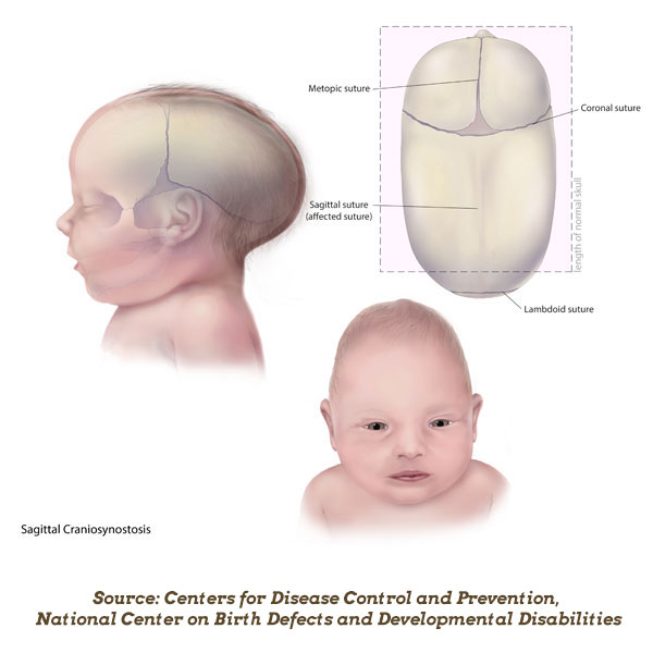 Scaphocephaly: A long, narrow head is common with midline "sagittal" synostosis, when the suture extending from front to back over the top of the head fuses too soon. Sagittal synostosis is the most common form of craniosynostosis, accounting for about 40% to 45% of cases.