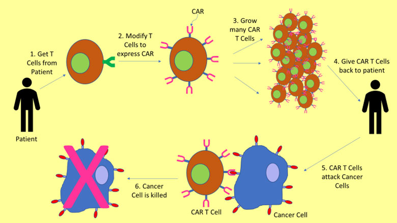 Scientists take a patient's own Killer T cells from a blood draw and in the laboratory add a protein receptor that is specific for a cancer cell marker (antigen). This new receptor called a CAR allows the Killer T cell to find and attack the cancer cell. The new T cells are given back to the patient into the vein as cancer treatment.