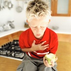 Although children under age four are most at risk for choking on food and small objects, youngsters in their middle years can choke too. A number of foods or other items (for instance, hot dogs, poorly chewed pieces of meat, grapes, raw carrots, hard candy, balloons, small toy parts) can become lodged in the child's airway (or trachea), keeping oxygen from reaching the lungs and the rest of the body as well. When the brain does not receive oxygen for more than four minutes, permanent brain damage and death can result. If your child is having some breathing difficulties—but is still able to speak or has a strong cough—do nothing yourself; the child's cough is better than any back blows or abdominal thrusts (Heimlich maneuver) you can administer. But call 911 so that she can be transported to an emergency department, since a partial blockage of the airway could turn into a complete one.