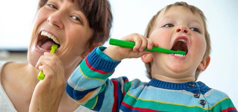• Go where no child has gone before. We suggest you pay particular heed (and direct your child's attention) to those teeth that are most likely to be neglected. While you're helping them brush, describe what you're doing in terms they can relate to by pointing out their "biting" teeth (the chewing surfaces), their "smile teeth" (you guessed it—right in the front), and the tricky teeth in the back. Your goal— to teach your child to leave no plaque unturned.