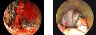 Figure 1 (left): Figure 1 (left): Endoscopic view of button battery injury to nasal septum in right nasal cavity of a child.