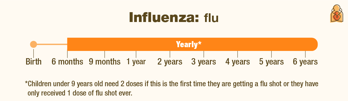 The flu vaccine is recommended for everyone starting at 6 months of age, with rare exceptions. The first time your child gets the flu (influenza) vaccine, if they are younger than 9 years old, they will also need a second dose 4 weeks later. Even healthy kids can develop severe complications from the flu that requires a hospital stay. Flu viruses change from year to year, so everyone needs to get a flu shot each year. Annual