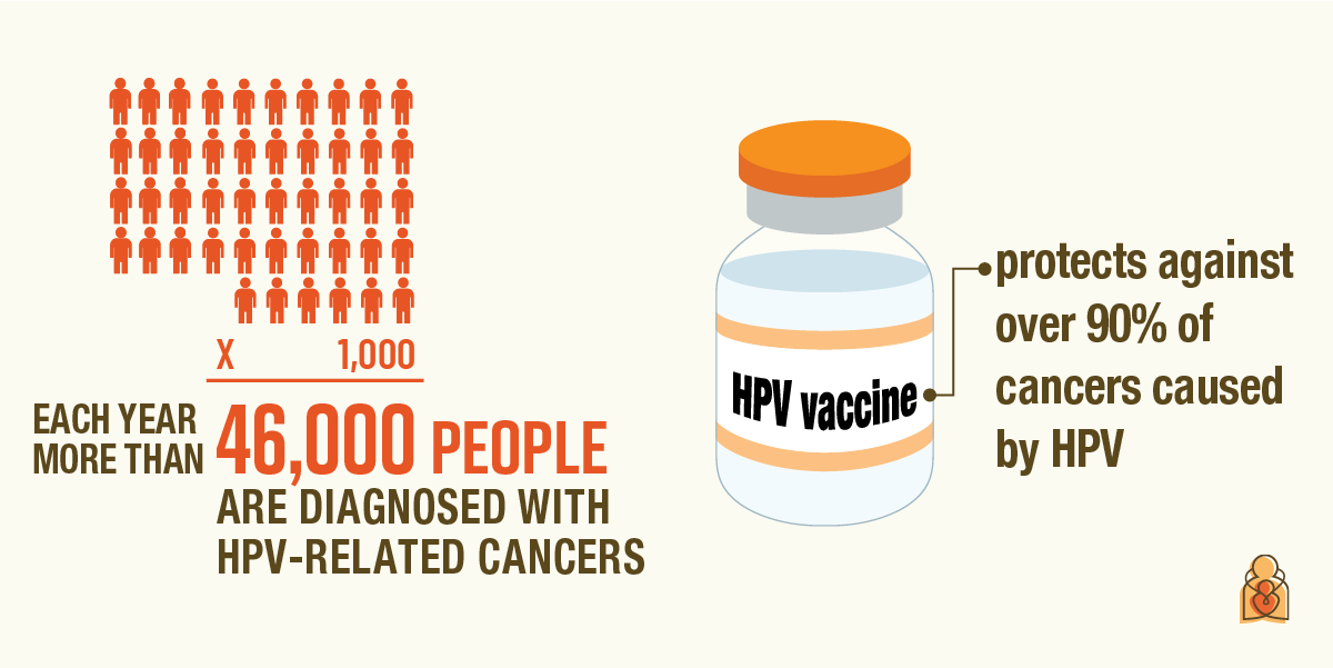 ​Each year more than 46,000 people are diagnosed with one of six types of cancer caused by HPV. Vaccination can prevent almost all HPV infections. Preventing HPV infection will protect against over 90% of cancers caused by HPV.