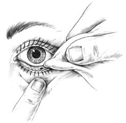 • Pull the lower lid out by pulling down on the skin above the cheekbone.