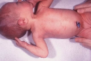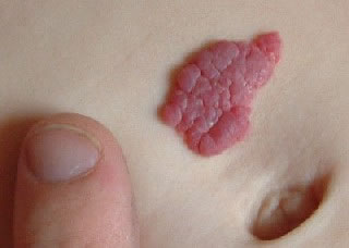 This photo shows a Strawberry Hemangioma near the navel. A hemangioma is a cluster of blood vessels that cause non-cancerous growths.