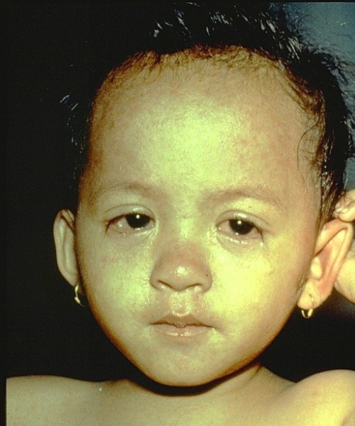 This photo shows a child with measles. The rash is likely in a later stage and starting to fade. Other visible symptoms are red, weepy eyes.