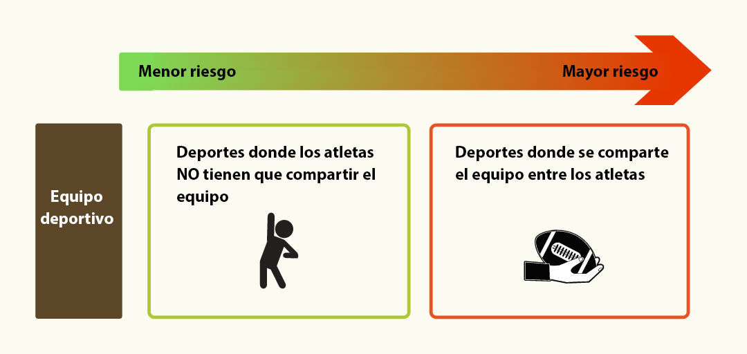 Los deportes y las actividades físicas en donde no se comparten los equipos, como en carreras de larga distancia, son probablemente menos riesgosos que los deportes como el fútbol donde se comparte el balón para jugar.