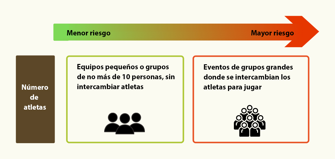Entre más personas haya para interactuar, mayor será la oportunidad para exponerse al COVID-19. Así que los equipos pequeños, grupos de prácticas o clases que permanecen juntos, en lugar de intercambiar con otros equipos, entrenadores o profesores serán una opción más segura. Esto también facilita contactar a los individuos en el caso de que se presente una exposición al COVID-19.