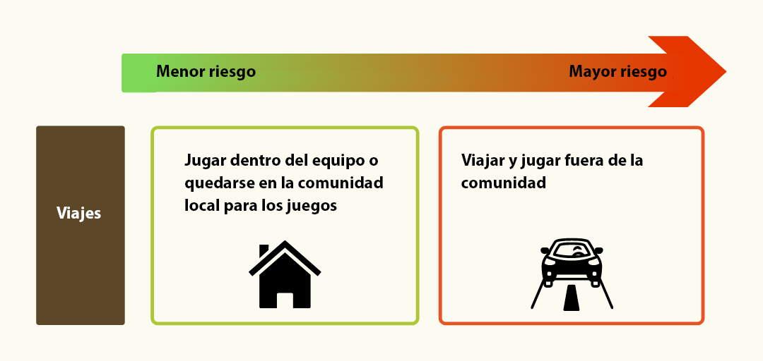 El permanecer dentro de su comunidad será más seguro que participar con equipos que viajan o se trasladan a otros lugares para competir. Viajar a zonas donde hay más casos de COVID-19 podría incrementar la posibilidad de transmisión y propagación. Los deportes donde se viaja también intercambian jugadores, así que por lo general los atletas están expuestos a más personas.