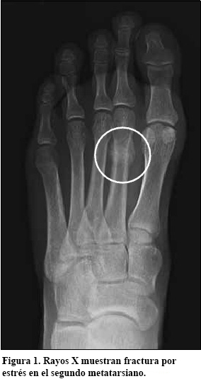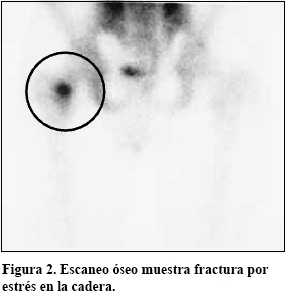 Para confirmar una fractura por tensión, puede que su médico le ordene una radiografía (ver Figura 1). Si la radiografía no muestra una fractura por tensión, puede necesitar realizar una gammagrafía ósea (ver Figura 2) o una resonancia magnética (IRM).