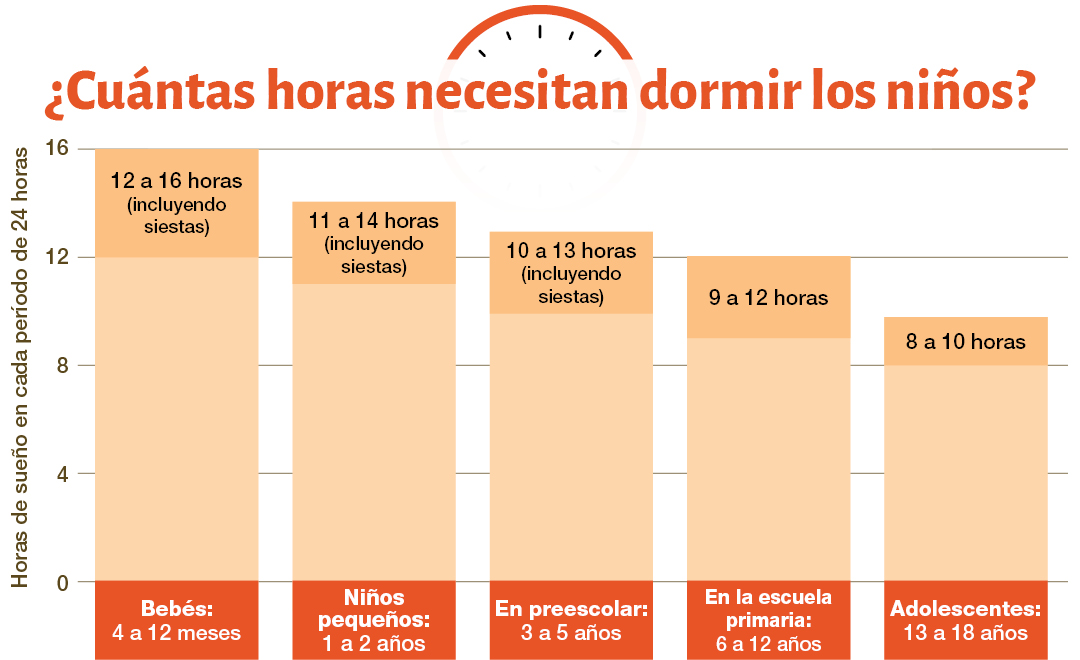 La American Academy of Sleep Medicine, AASM (La Academia Estadounidense de la Medicina del Sueño) brinda pautas útiles sobre el tiempo que los niños necesitan para dormir en las diferentes etapas de su desarrollo. Tenga presente que estas cifras reflejan el total de horas de sueño en un periodo de 24 horas. Así que si su hijo o hija todavía toma siestas, tiene que tomar este tiempo en cuenta cuando sume las horas típicas que duerme.