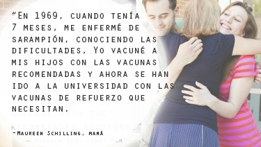 Sus experiencias han formado sus puntos de vista sobre las vacunas, y la han motivado para que sus niños tengan todas sus vacunas al día. su hija de 20 años y su hijo de 23 partieron a la universidad con las vacunas de refuerzo recomendadas.