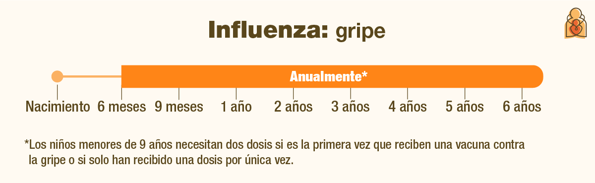 gripe está recomendada para todas las personas a partir de los 6 meses de edad, con raras excepciones. La primera vez que su hijo reciba la vacuna contra la gripe y si el niño es menor de 9 años, también necesitará una segunda dosis cuatro semanas después. Incluso los niños sanos pueden desarrollar complicaciones graves de la gripe que requieran hospitalización. Los virus de la gripe cambian de un año a otro, por lo que todos deben vacunarse contra la gripe cada año. Las vacunas anuales contra la gripe previenen que los niños se enfermen gravemente.