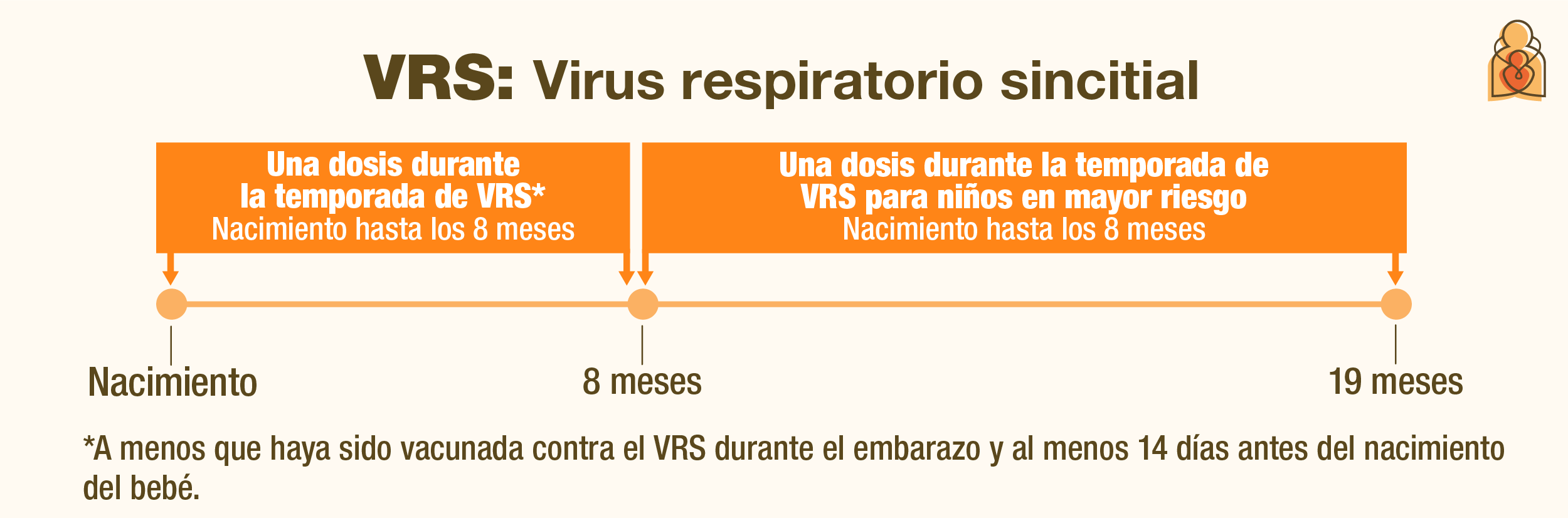 El virus respiratorio sincitial (VRS) suele ser común entre finales de otoño y principios de primavera. Este virus es la principal causa de hospitalización en bebés. Actualmente existen dos vacunas para bebés y algunos niños pequeños. Una es la vacuna contra el VRS, que se administra durante el embarazo. Puede recibirla entre las semanas 32 y 36 de embarazo y si espera a su bebé durante la temporada de VRS.